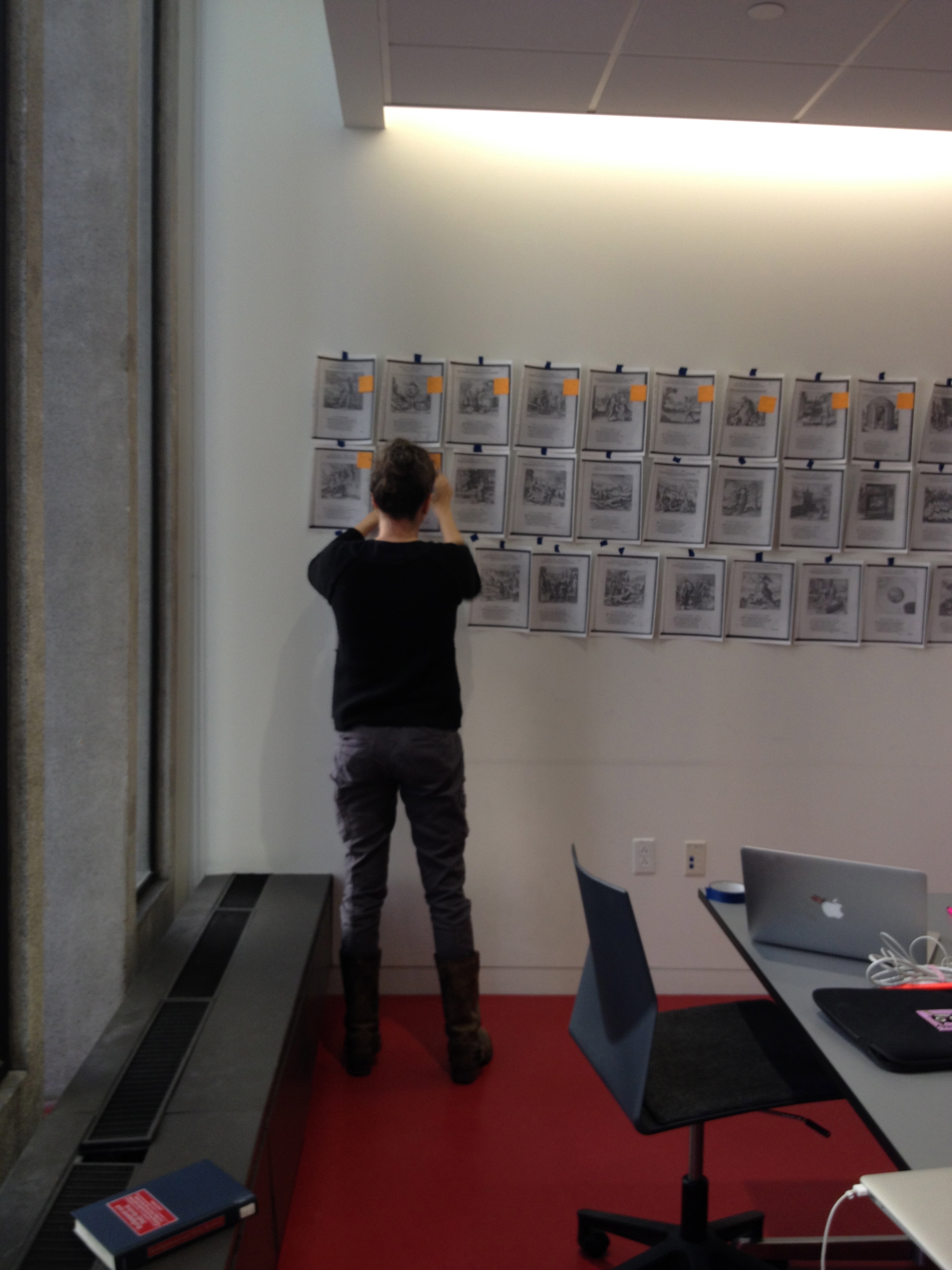 Project Atalanta keyword session in the Rockefeller Library at Brown University; we printed out all fifty emblems from Atalanta fugiens, which I taped to the wall (I prefer to work this way as I find it easier to discern visual relationships), November 2016