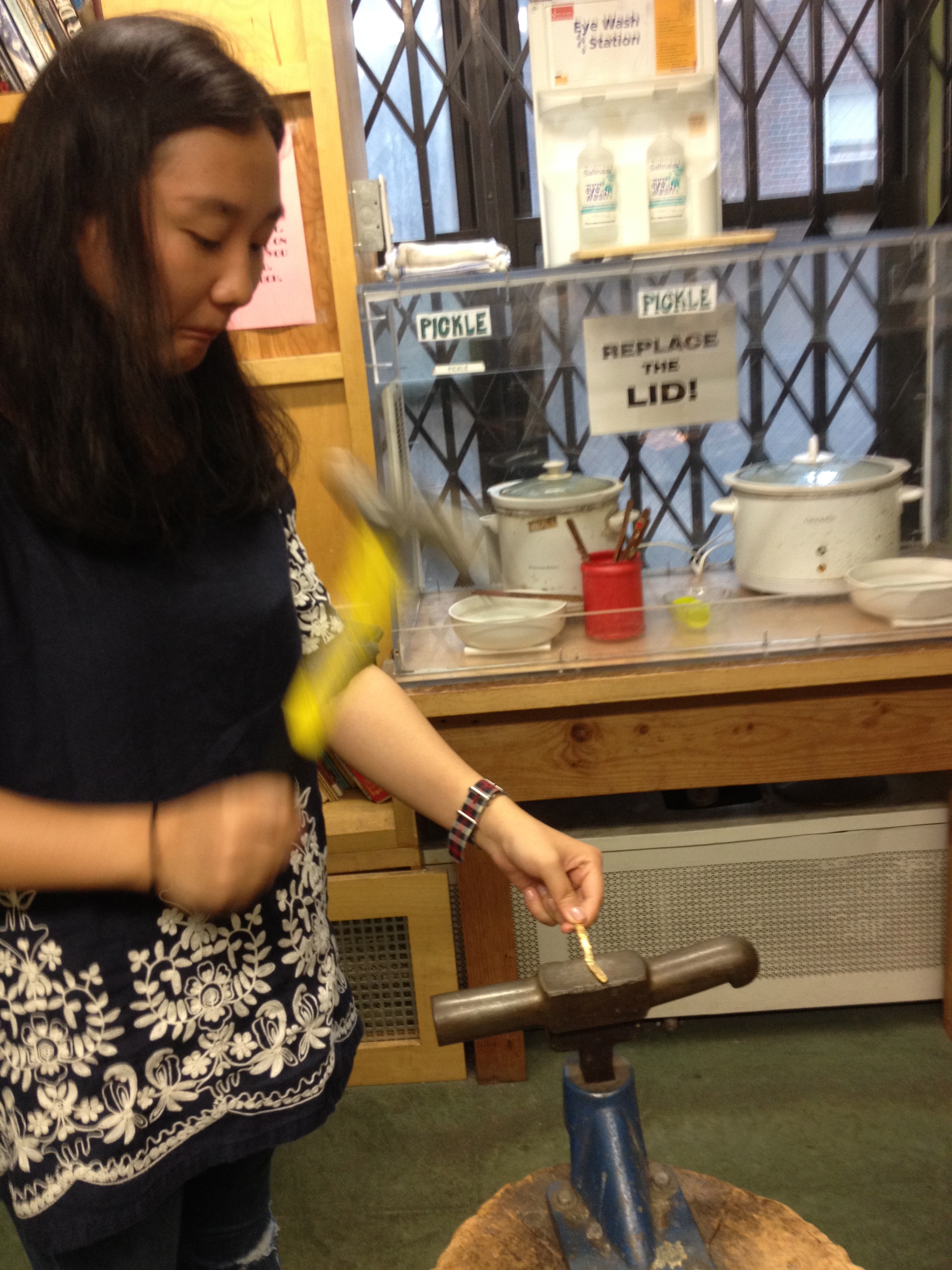 A student gets hands-on experience with a hammer and anvil to experience what it’s like to forge gold — this is a basic metalworking technique