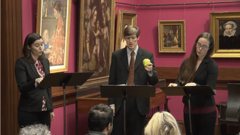 Molly Netter (soprano), Graham Bier (bass), and Robin Bier (contralto) performing a musical fugue from Michael Maier’s Atalanta fugiens (1618)