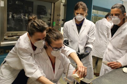 Donna showing M&K student Sofia Gans how to use a jewelers saw to cut through cuttle bone, this is part of its preparation for using this material to cast metal objects; another M&K student Giulia Chiostrini and M&K Director Pamela Smith look on