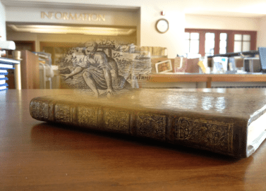 Photo taken of the Science History Institute’s 1618 copy of Atalanta fugiens in the Othmer Library – this image of Atalanta stooping to pick up one of the Golden Apples during her race with Hippomenes is featured in the title page of Atalanta fugiens